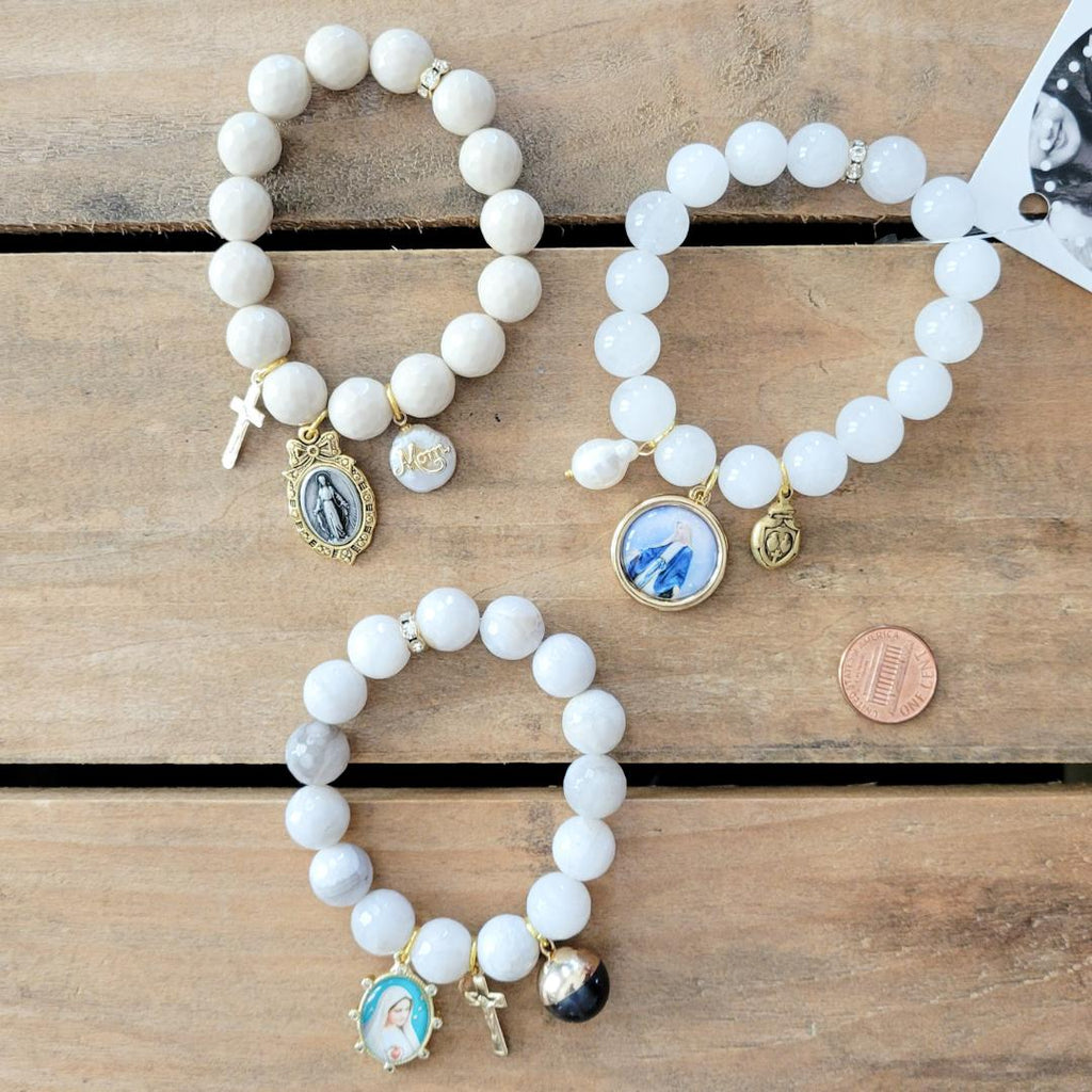 St. Mary Medal, freshwater pearl, and Sacred Heart of Jesus Medal come together on this beaded bracelet — a blend of grace, faith, and everyday protection.